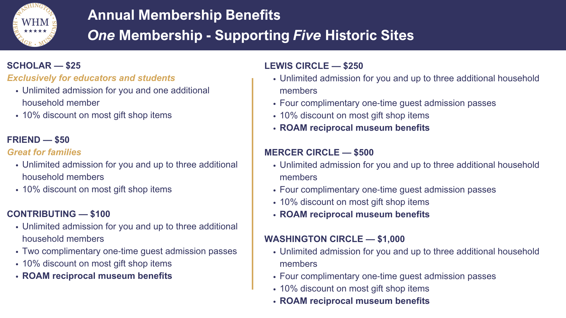 NEW BENEFIT! WHM is now affiliated with the Reciprocal Organization of Associated Museums (ROAM), a program that connects 500+ participating museums across the US and Canada. Members of the Contributing level or higher will be eligible to visit other ROAM-affiliated museums and receive discounted admission. Additionally, some ROAM museums also offer discounts for special events, gift shops, and restaurants. Visit the ROAM website to view a full list of museums.